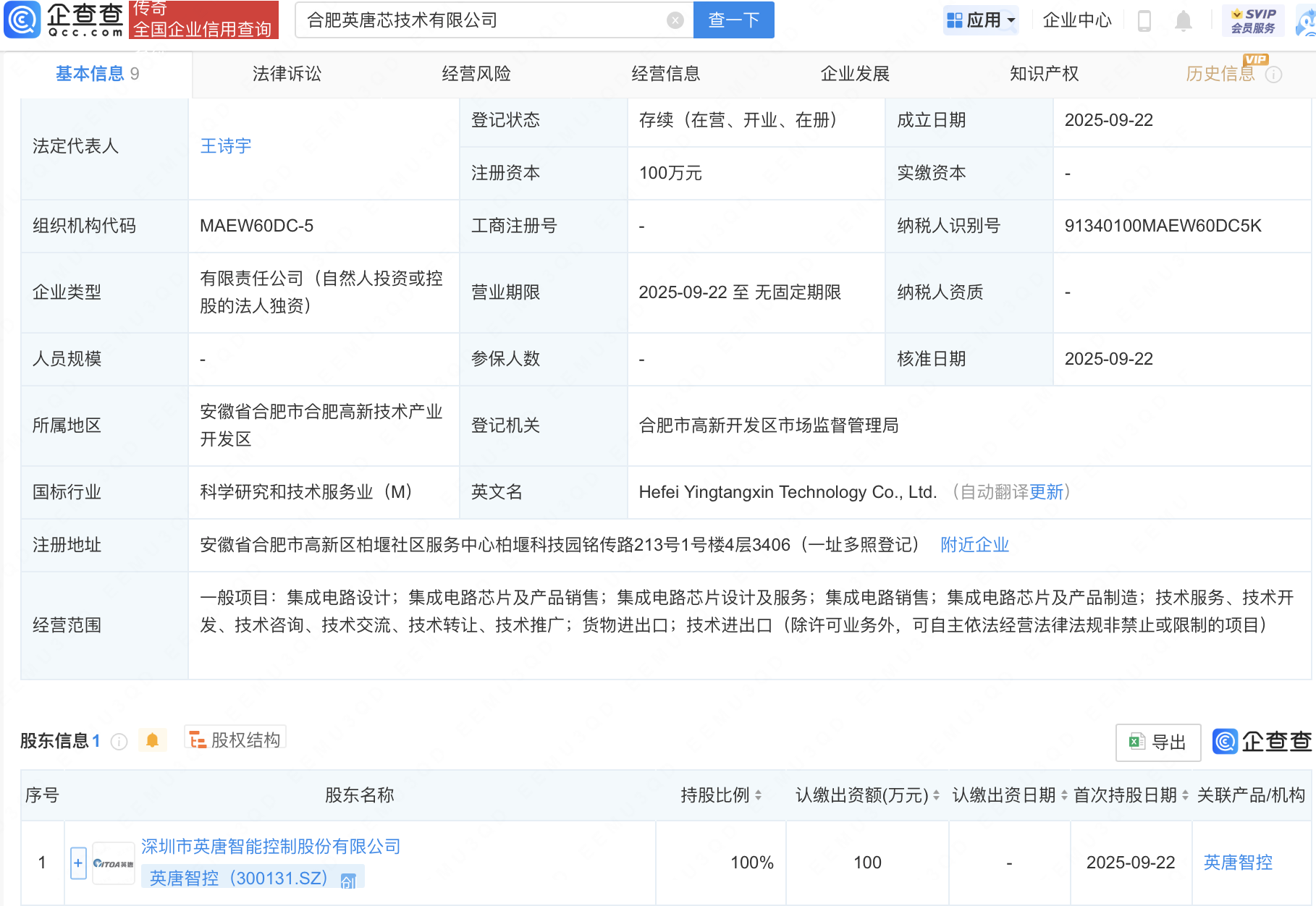 近日,合肥英唐芯技术有限公司成立,法定代表人为王诗宇,经营范围包含:集成电路设计;集成电路芯片及产品销售;集成电路芯片设计及服务;集成电路销售;集成电路芯片及产品制造等。企查查股权穿透显示,该公司由英唐智控(300131)全资持股。